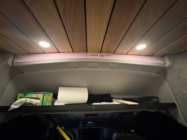 After all the boards were up, the front area by the headliner needed some love. It looked kinda raw with slight vertical alignment issues with some of the boards as they're just sitting there under tension. The perfect 1/4" spacing between them is achieved with sneaky little 1/4" baltic birch chunks with black sharpie on them shoved in between. Plenty of tension to keep those in place without any glue or fasteners.