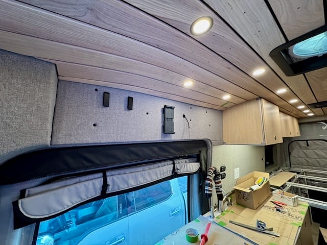 Planning the exact location of the puck lighting was a complete PITA. I actually had a google spreadsheet at one point with all the potential interferences, each rib location, where on each rib's furring strip had the overlap I could drill into, etc. Finally arrived at a plan where they could be 20" on center between each light except for the most rear - which isn't visually apparent from the front slider area. The shower forced 2 lights off their alignment line a bit, but at least they didn't end up "halfway" into the shower door. The lights have to be in the center of the 3.5" boards ideally so that added another constraint. And despite the visual 'disguise' I was able to use, there's spots where the curvature of the van itself made things challenging.