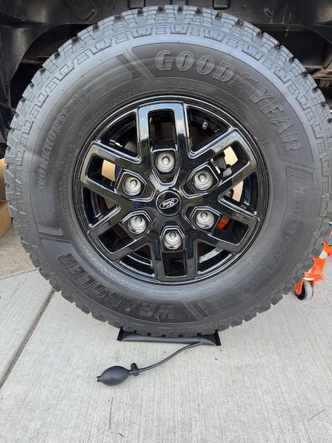 And the best tip ever for struggling with large heavy tires when trying to magically line up 6! lugs. Use an air lift wedge jack! You can focus on alignment and rotation on a few lugs while raising slightly with a few squeezes. A little push home and you're golden.